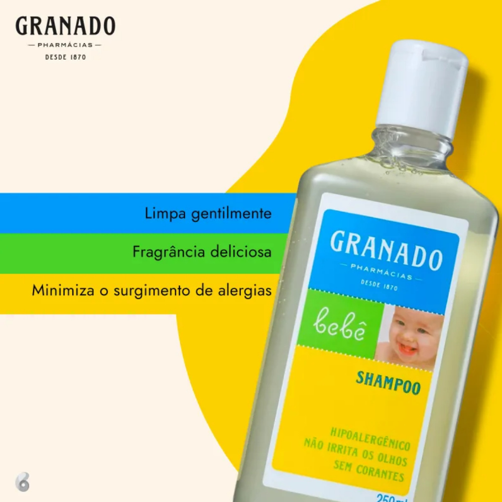 O Shampoo Bebê Granado 250ml é formulado com tensoativos suaves que limpam delicadamente, deixando os fios macios, fáceis de pentear e perfumados. Não irrita os olhos, sendo especialmente desenvolvido para o cabelo sensível do bebê.